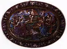 - вазу для охолодження вина, майстерня Фламініо Фонтани (період активної роботи: 1571—1591), Італія, Урбіно, 1574, глазурована оловом кераміка, розписана (кімната для куріння);