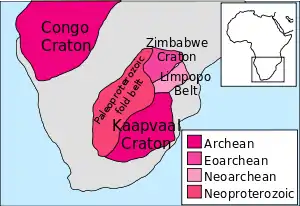 Кратон Зімбабве створено з двох невеликих блоків — Токве на півдні і набагато меншого сегменета Родездейл на півночі. Породи цих сегментів були датовані 3.46 млрд років[1] стабілізація обох сегментів відбулась близько 3,3 млрд років[3][4]