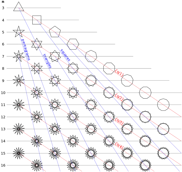 Довільна n-кутна зірка будується в такий спосіб: будується коло. (Назвемо відрізок, що перетинає це коло не більш ніж в одній точці, «зовнішнім»). На ній довільним чином вибирають n точок (назвемо їх «синіми»). Далі поза кругом, обмеженим цим колом, ставиться n точок (назвемо їх «червоними») так, аби будь-яка синя точка була сполучена зовнішніми відрізками рівно з двома червоними, а будь-яка червона точка була сполучена двома зовнішніми відрізками рівно з двома синіми; при цьому жодні два з цих відрізків не повинні перетинатися, окрім як у кінцях; і кути між двома відрізками, що виходять із однієї синьої точки, — т. зв. зовнішні кути зірки, — повинні бути тупими (отже, кути між двома відрізками, що виходять із однієї червоної точки, — т. зв. внутрішні кути зірки, — повинні бути гострими).