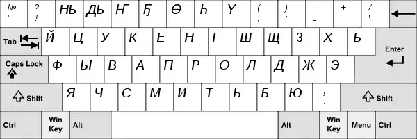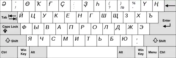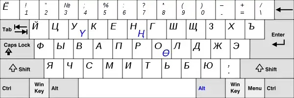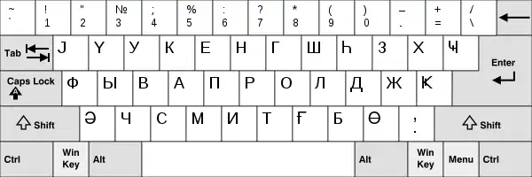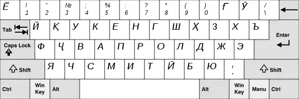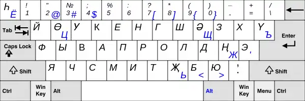 Російські літери, які рідко використовуються на татарських мовах, надруковані AltGr (права Alt). Цей макет також підходить для калмиків та туркменів (кирилиці), оскільки їхні алфавіти практично ідентичні татарським.