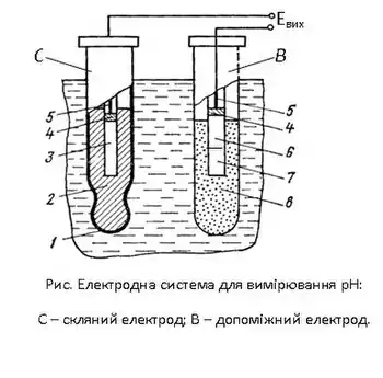 Скляний електрод являє собою товстостінну скляну трубку з тонкостінною порожнистою кулькою (1), заповнену буферним розчином (2). У цей розчин поміщено контактний електрод (3), що передає потенціал через ртутний контакт (4) і провідник (5) на вихід датчика. Допоміжний електрод (В) подає потенціал на вихід (Евих) за допомогою ртутно-каломелевої системи (6) зі скляною ватою (7), вміщених у насичений розчин хлористого калію (8).