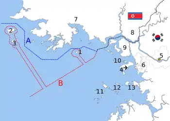 30 серпня 1953 року командування багатонаціональними силами ООН встановило північну розмежувальну лінію (ПРЛ), яка визначала морську межу між Південною Кореєю та Північною Кореєю, яку не визнала Корейська Народно-Демократична Республіка. У 1999 році КНДР ввела морську розмежувальну лінію (МРЛ), яка визначала морську межу між КНДР та РК, яку не визнала Республіка Корея[4].