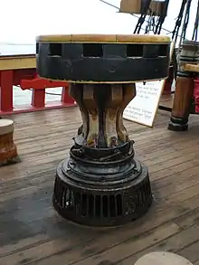 Найбільший кабестан на старовинному вітрильному кораблі, який розташовувався між грот- і бізань-щоглами, носив назву мейн-кепстон (від англ. main capstan — «головний кабестан»)[8].