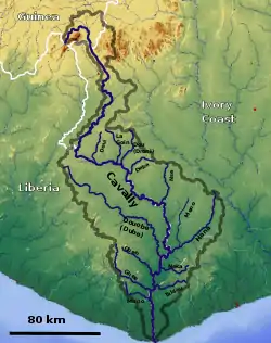 Площа водозбору ріки Кавалла ділиться між Гвінеєю, Кот-д'Івуаром і Ліберією так[1]: