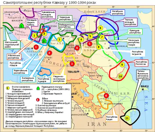 Під час Розпаду СРСР союзні республіки Грузія, Вірменія та Азербайджан отримали незалежність. Спроби унезалежнитись або створити свої автономії здійснила також і низка інших народів та етнічних груп. Це призвело до виникнення невизнаних держав Чеченська Республіка Ічкерія, Південна Осетія, Абхазія, Нагірно-Карабаська Республіка та декількох війн і етнічних конфліктів на Кавказі, які не були розв'язані, і зараз перебувають у замороженому стані. На Північному Кавказі спостерігається етнічна напруженість та протистояння «традиційного ісламу» з салафізмом, радикальний напрямок якого веде збройну боротьбу. За підрахунками видання «Кавказский Узел», у 2012—2014 роках у цьому конфлікті щороку гинуло кількасот людей[1].