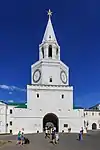 Спаська вежа. Побудована у другій половині XVI століття псковскими зодчими Іваном Ширяєвим та Постником Яковлєвим. З внутрішньої, північного боку фортеці до Спаської вежі примикала надбрамна Спаська церква, яка на цей момент стала одним цілим з вежею. Її типово Псковський по архітектурних елементів фасад звернений на головну вулицю кремля. Наприкінці XVII століття замість 3 яруси вежа була надбудована двома цегляними 8-гранями ярусами з цегляним ж шатром, отримавши свій нинішній, звичний казанцям вигляд. До 1917 р вежу вінчав двоголовий герб Російської держави, в верхньому ярусі в XVIII столітті було встановлено годинник „з дзвоном“ і ще раніше перенесений з невеликої дзвіниці (нині втраченої, яка перебувала на прясла стіни по ліву сторону вежі) великий набатний дзвін. Перед вежею до середини XIX століття був рів з кам'яним мостом. |