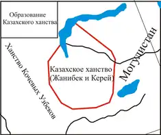 Спочатку Казахське ханство обіймало території західного Семиріччя, долин Чу, Таласса та Кози-Баші. Стихійною дією народних мас було започатковане об'єднання розрізнених груп казахських племен, у тому числі й семиріченських, у одну державу. Хан Моголістану Елабуга не мав сил зброєю відбити набіги цих племен та й взагалі бачив у особі воїнів Джанібека та Гирея захисників своїх західних кордонів від свого брата Юнуса, якого підтримував нащадок Тимура Абу Саїд. Та й цілком зрозумілим було його бажання привернути на свій бік ворогів свого ворога.