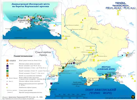 | Акра · Апатур · Артезіан · Ахіллей · Гераклій · Гермонасса · Горгіппія · Зенонів Херсонес · Ілурат · Казека · Кепи · Кіммерік · Кітей · Корокондама · Мирмекіон · Німфей · Пантікапей · Партеніон Порфмій · Тірамба · Тірітака · Фанагорія · Феодосія · |