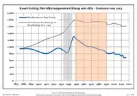 Динаміка населення з 1875 року в сучасних кордонах (Синя лінія: населення; Пунктир: відносна порівняльна динаміка населення землі Бранденбург; Сірий фон: період Третього рейху; Помаранчевий фон: період НДР)