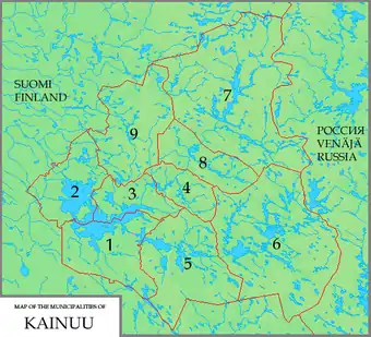 Кайнуу складається (з 1.1.2007, коли Вуолийоки об'єдналася з Каяані) з дев'яти муніципалітетів. У дужках зазначена кількість жителів на 31 грудня 2009.[1]