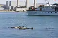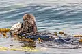 Мати-калан із дитинчам в гавані Морро Бей (Каліфорнія). Самки морських видр мають два черевних соски, вони плавають на спині для годівлі дитинчат