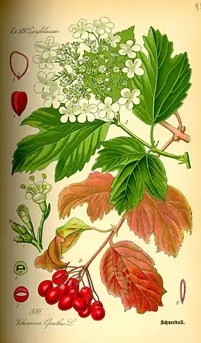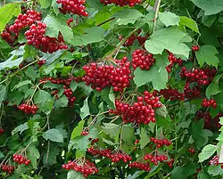 Калина звичайна, червона калина (Viburnum opulus); місцеві назви: карина, калена, калинина — високий гіллястий кущ заввишки 2—4 м з сірою корою, з роду калина (Viburnum), родини адоксових (Adoxaceae).