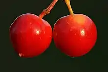 Плоди — ягодоподібні червоні овальні кістянки (6,5-14 мм завдовжки і 4,5-12 мм завширшки), містять забарвлену червоним соком плоску тверду кісточку. Залишаються на гілках дуже довго і прикрашають кущ навіть взимку.