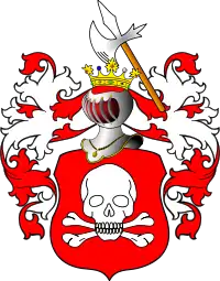 У червоному полі срібний череп на двох схрещених срібних кістках. В клейноді в геральдичній короні срібна алебарда вправо застрягла в шоломі[1].