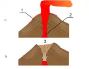 Кальдера — це по суті називають конус вулкана, що просів углиб. Якщо вибух зриває значну частину конуса старого вулкана, на його місці під час чергових вивержень виростає новий конус. Виходить нібито вулкан, утворений у вулкані. Цей тип вулканічного апарату отримав назву соми.