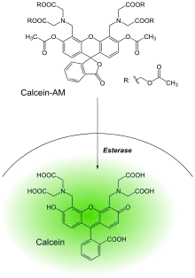 Нефлуоресцуючий ацетометокс-дериват кальцеіну (кальцеін AM, АМ = ацетометил) використовується в біології, через свою здатність проникати через клітинну мембрану в живі клітини, що робить його корисним для тестування клітин на життєздатність і для короткочасного нанесення мітки на клітини. В якості альтернативи можуть бути використані Fura-2, Furaptra, Indo-1 та екворин. Ацетометокси-група приховує ту частину молекули, яка хелатує іони Са2+, Mg2+, Zn2+ та інших. Після транспортування в клітини внутрішньоклітинні естерази видаляють ацетометоксигрупу, молекула потрапляє всередину і дає сильну зелену флуоресценцію. Оскільки мертвим клітинам не вистачає активних естераз, маркуються лише живі клітини [4]. Підрахунок проводиться за допомогою проточної цитометрії.