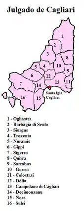 Площа становила 8000 км². Простягалася південною і південно-східною частиною Сардинії. Адміністративно поділялося на 16 кураторій: Ольястра, Сеуло, Сіурга, Герреї, Квірра, Трексента, Нурамініса, Доліа, Кампідано ді Кальярі, Саррабуса, Колострая, Гіппі, Сіксері, Децімо, Нора, Сульцис. На чолі їх стояв куратор, якого призначав юдик. У свою чергу кураторії поділялися на бідди (села), на чолі яких перебував майор. Його призначав куратор. Куратор і майор мали фіскальні, судові та поліцейські обов'язки.