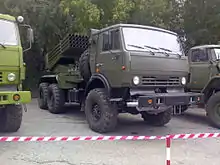 Російські терористи використовують у війні на Сході України системи залпового вогню 2Б26 «Град» на шасі КамАЗ-5350 «Мустанг».[15]