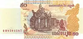 На лицьовій стороні нової купюри в 50 рієлів, розміром 130×60 мм, знаходиться зображення комплексу Ангкор-Ват. На зворотному боці — зображення греблі та мосту. Купюра захищена водяним знаком у вигляді тексту на місцевій мові, вертикально розташованого по ширині всієї банкноти. На банкноті немає захисної нитки. Основні кольори купюри: темно-коричневий, фіолетовий, оливковий.