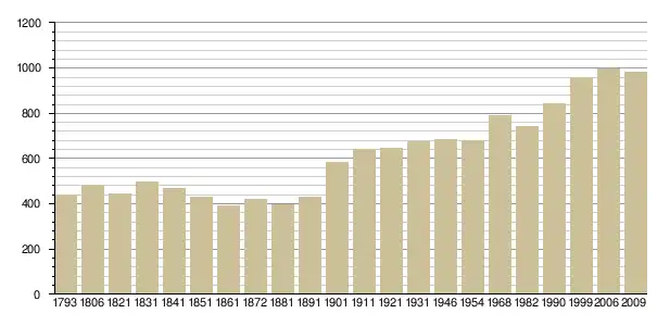 Динаміка населення (base Cassini de l'EHESS pour les nombres retenus jusque 1962[3], base Insee à partir de 1968 (population sans doubles comptes puis population municipale à partir de 2006)[4] · [5] ):