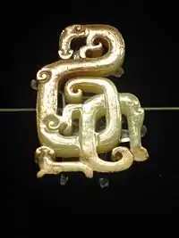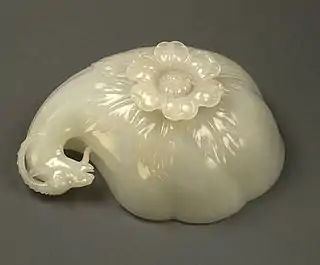 - Скульптура «Хлопчик верхи на феніксі» ( фенікс з головою фазана, тілом качки-мандаринки і хвостом павича ), біло-зелений нефрит з Циньханя