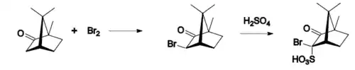 Камфора може бути отримана з альфа-пінену, якого є багато в оліях хвойних дерев, і шляхом перегонки зі скипидару, отриманого як побічний продукт хімічної обробки целюлози. З використанням оцтової кислоти як розчинника і сильної кислоти як каталізатора, альфа-пінен легко перебудовується у камфен, який у свою чергу через перегрупування Вагнера-Меєрвейна перетворюється в ізоборніл катіон, який захоплюється ацетатом, після чого утворюється ізоборнілацетат. Гідроліз до ізоборнеолу з подальшим окисненням дає рацемічну камфору.