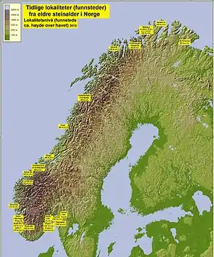 До моменту появи людини на цій території вже жили олені, згодом до них додалися тури, зубри і лосі, полювання саме на цих тварин вважається найдавнішим заняттям норвежців. Найстаріші поселення розташовувалися в місцях скупчення оленів на шляху їх міграції. Більшість стародавніх стоянок було виявлено біля самої води - або біля річок, або поряд з фіордами, саме через зручність.[1]
