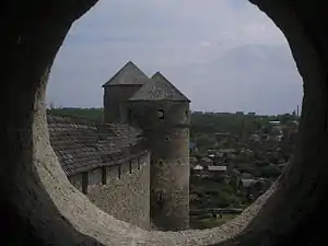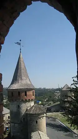 Друга башта з південного боку замку звалася «Ковпак»; вона також, як каже опис 1544 p., добре збудована на міцному фундаменті. Коло тої башти була над самою скелею давня й дуже зіпсована мала башта, призначувана для сторожі, щоб, коли нападатимуть вороги, охороняти дорогу, яка йшла тут з Хотина.
