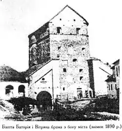 Від нижніх башт дорога йшла на гору узбіччям під захистом муру, що був з боку провалля, а на верху гори треба проїздити через ворота, так звану Вітряну браму. Біля тих воріт стоїть величезна башта Баторіева, або «Семиетажна». Над Вітряною брамою з боку міста прибито таблицю з таким написом: