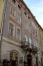 Вікна прикрашені глибоко профільованими обрамленнями, на другому поверсі — балкон з декоративною металевою решіткою.