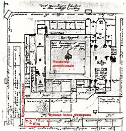 У XIV столітті було остаточно сформовано житлову забудову та лінію міських фортифікацій, яка через профіль місцевості отримала трапецієподібну форму. Через це вулиця Вірменська була прокладена під певним кутом до решти вулиць Середмістя і на її початку біля вулиці Краківської ширина північного житлового кварталу поміж нею і площею Ринок майже вдвічі перевищувала ширину аналогічного житлового кварталу наприкінці вулиці. Внаслідок цього довжина останньої кутової парцелі була меншою за довжину фасадних приринкових кам'яниць (7,1 м × 20,6 м). Біля неї вздовж монастирських володінь домініканців йшов ще один доволі стрімкий проїзд з вулиці до площі перед фасадом костелу домініканців, званий вулицею Домініканською бічною, яку об'єднали 1871 року ще з двома вулицями, спільно названими вулицею Бляхарською, а з 1949 року вулицею Івана Федорова.