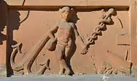 - давньогрецький бог торгівлі Гермес, який, спираючись на якір, кадуцеєм благословляє корабель;