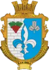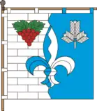 Квадратне полотнище поділене хвилясто вертикально на дві рівновеликі смуги — білу муровану древкову і вільну синю. На лінії перетину розтята лілея змінних з полями кольорів. У верхньому древковому куті червоне гроно калини з зеленими листками, у лівому вільному куті біла гілка сосни.
