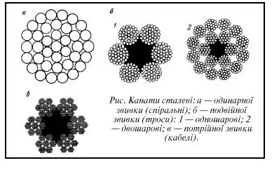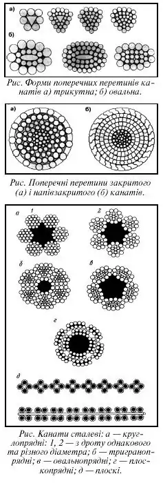 Сталеві канати розрізняються за формою поперечного перерізу і механічними характеристиками дроту, осердь.