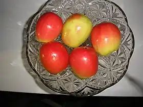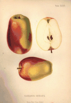 Середньопізній зимовий сорт, плоди крупні або середньої величини, подовжено-циліндричної форми, злегка звужуються біля чашечки, вага 120—140 г, зі щільною шкіркою жовтаво-зеленого або жовтого кольору з карміново-яскраво-червоним бочком на сонячній стороні, плодоніжка тонка, довжиною 12—15 мм. Дерева сильнорослі, крона вузькопірамідальна, рослині, для гарного росту, потрібне захищене від вітру місце. Перші плоди з'являються на 15-й рік після посадки, плодоносить раз на 2—3 роки, плоди ніжні, потребують обережного ставлення під час збору і транспортування: кожне яблуко обмотують папером, кожний ряд (не більше 4-х) перекладають тонкою стружкою. Дорослі рослини плодоносять рясно — 200—300 кг з одного дерева, а за свідченням відомого помолога Льва Платоновича Симиренка, в 1883 році в Криму з одного дерева зібрали врожай 87 пудів (1392 кг).