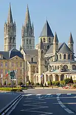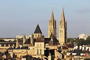 - З часів Вільгельма Завойовника вціліли уславлені пам'ятки нормандської романіки — соборна церква Сент-Етьєн при чоловічому абатстві та церква Трійці при жіночому монастирі. У цих храмах до Французької революції були поховані сам Вільгельм Завойовник і його дружина Матильда Фландрська. Фасад соборної церкви строгий та лаконічний, 90-метрові вежі увінчані шпилями XIII століття. Решта будинків чоловічого абатства перебудовані в XVII столітті; з 1960 року тут розташовані органи місцевого самоврядування.