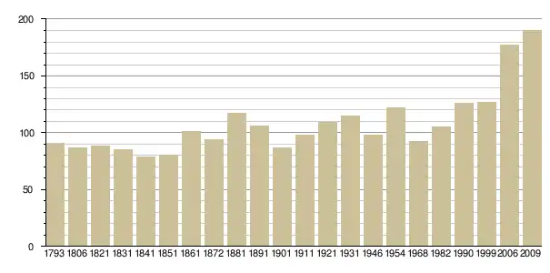 Динаміка населення (base Cassini de l'EHESS pour les nombres retenus jusque 1962[3], base Insee à partir de 1968 (population sans doubles comptes puis population municipale à partir de 2006)[4] · [5] ):