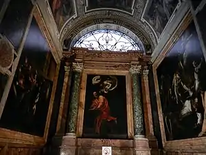 В каплиці панують три картини роботи Мікеланджело да Караваджо. Каплиця затісна і темна, освітлена одним вікном над капличним вівтарем. За контрактом, Караваджо брався створити три картини зі сценами житія Євангеліста Матвія, що мали замінити фрески бічних стін каплиці Кантареллі, так і не виконаних д'Арпіно.