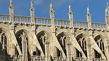 На даху каплиці, на верхівках пінаклів, а також на пінаклях збоку каплиці, знаходяться 76 геральдичних статуй, що представляють Звірів королеви — королівських щитотримачів Англії. Статуї представляють 14 геральдичних Звірів: лева Англії, червоного дракона Уельсу, пантеру Джейн Сеймур, сокола Йорків, чорного бика Кларенсів, єйла Бофортів, білого лева Мортимерів, хорта Річмондів, білого оленя Річарда ІІ, срібну антилопу Богунів, чорного дракона Ольстерів, білого лебедя Герефорда, єдинорога Едуарда ІІІ та золоту лань Кента[3].