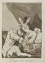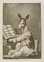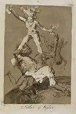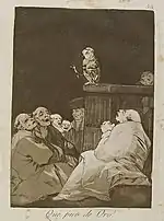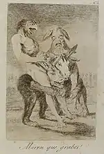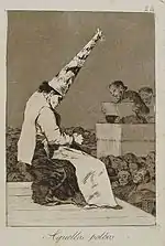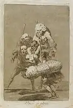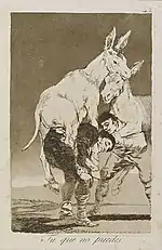 «Які поважні персони!» | ¡Miren que graves! | Двоє відьмаків їдуть на істотах з віслючими головами. В них вбачаються правителі: рішучий, але злодій (з головою орла) і вірний державі, але боягуз (з головою зайця), що сидять на шиї в неосвіченого народу.