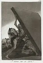 «А вони так і не йдуть» | ¡ Y aún no se van! | Виснажений чоловік тримає камінну плиту, що загрожує розчавити і його і товариша. За цим спостерігають люди, що співчувають, але так і не приходять на допомогу.
