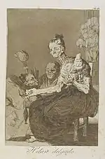 «Чимало було суперечок про те, хто гірший: чоловіки чи жінки. Пороки і тих і інших походять від поганого виховання. Розпуста чоловіків тягне за собою розпусту жінок. Пані на цьому офорті так само безрозсудна, як і красунчик, який розмовляє з нею, а щодо двох мерзенних старих, то і вони одна одної варті». |