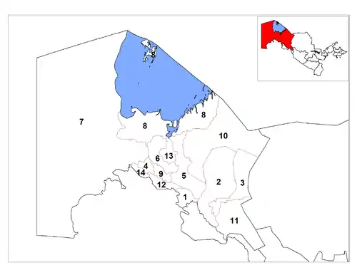 | 13 | Чимбайський | місто Чимбай | 1444[4] | 76422 | 1 | 1 | 11 | бл. 1926 |