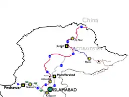 | Міста | Кашгар, Упал, Ташкурган, Гулміт, Гілгіт, Абботтабад, Хассанабдал |