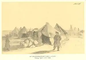 При виході з міжгір'я Сюнкукх була третя тривала зупинка, під час якої почали вивчати поклади бурого вугілля. Цю місцевість, а також стоянку експедиційного табору відтворено в серії малюнків «Сюнкукх»[2]. Звідси загін попрямував до урочища Акмиш. Караван дослідників поблизу гір Чиркалатау та Коксуйру художник показав на малюнку з позначкою 18. На вершині гори Чиркалатау тоді ще збереглися руїни давньої фортеці. У вільний час Шевченко напружено працював художником, робив екскурсії в навколишні гори, в казахські аули. В урочищі Акмиш він виконав тринадцять творів, зазначивши на них назви місцевостей і порядкові номери («Акмиштау», «Кайрактау», «Чиркалатау»[3], «Коксуйру», «Гірське пасмо Актау», «Експедиційний табір» та ін.). Про те, що Шевченко відвідував казахські аули, свідчать акварель «Далісменмула-ауліє» під № 22, сепія «Тріо» та окремі замальовки з життя й побуту казахів (останні не пронумеровані, бо випадають із загальної серії каратауських пейзажів). З урочища Акмиш учасники експедиції перейшли в долину Кугус, де виявили поклади вугілля та пісковику з амонітами.
