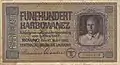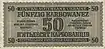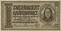 Написи німецькою зверху вниз і українською знизу вверх: «Центральний емісійний банк Україна» прописом номінал купюри «Фальшування карається тяжкою тюрмою». В центрі крупним шрифтом і в 4-х кутах дрібним шрифтом номінал цифрами |
