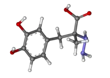 Карбідопа — синтетичний лікарський засіб, який за хімічним складом є амінокислотою та похідним тирозину. Самостійного значення у лікуванні захворювань карбідопа не має, а застосовується виключно в комбінації з леводопою для лікування паркінсонізму.[2][3] Механізм дії леводопи полягає у тому, що вона, на відміну від свого метаболіту дофаміну, може проникати через гематоенцефалічний бар'єр[8][9], де вона метаболізується до дофаміну, що призводить до усунення дефіциту дофаміну, який і спричинює більшість клінічних симптомів паркінсонізму, наслідком чого є усунення у хворих симптомів цього захворювання.[8][5] Оскільки майже вся ендогенна леводопа (98 %) метаболізується в організмі до дофаміну, який не проникає через гематоенцефалічний бар'єр, та спричинює низку побічних ефектів препарату, зокрема нудоту і блювання, тому препарат застосовується з інгібітором декарбоксилази, найчастіше карбідопою[10][8], іноді також з інгібітором катехол-О-метилтрансферази (ентакапоном).[4] Інгібітор декарбоксилази, зокрема карбідопа, запобігає швидкому метаболізму леводопи, унаслідок чого вона може проникнути через гематоенцефалічний бар'єр, а також унаслідок зниженню утворення великої кількості периферичного дофаміну запобігається виникнення нудоти та блювання, які є найчастішими ранніми побічними ефектами леводопи.[5][8]