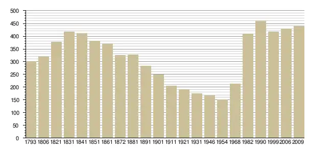 - Notice communale Cassini (Recensements de population - Tableau і diagramme d'évolution, наведено за французькою вікіпедією