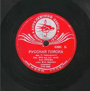 1938 року було видано грамплатівку із записом «Російського танцю» (рос. «Русская пляска») Петра Чайковського у виконанні оркестру Всесоюзного радіокомітету (соліст Михайло Каревич, диригент Олександр Орлов) [7].