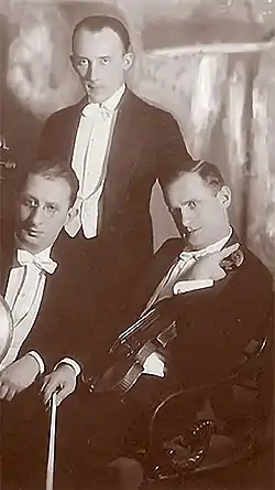| Тріо імені Станіславського. Москва, 1929 рік. Справа — Михайло Каревич, у центрі — піаніст Лев Миронов. Фото Мойсея Наппельбаума | |